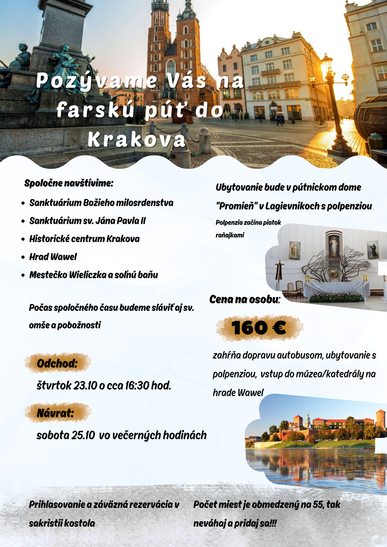 23. septembra 2025Farská púť do Krakova od 23.10.2025 – odchod o 16:30, do 25.10.20025 príchod večer